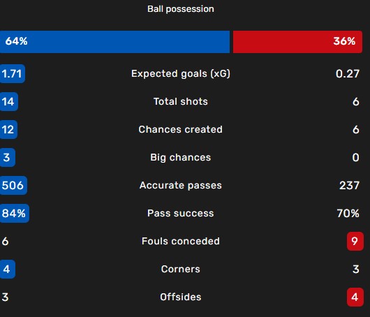 I numeri parlano sicuramente dei padroni di casa come quelli che hanno fatto la partita, ma il Monaco è stato in grado di mettere in campo una buona gara d'attesa sfruttando al meglio la fisicità dei propri elementi, pur producendo molto poco in zona offensiva, come testimoniano il dato sul possesso palla e sulle occasioni create.