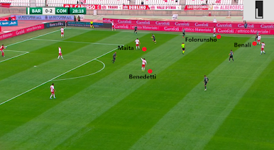 Sabato, ad esempio, nel secondo tempo il Bari ha sviluppato gran parte delle proprie trame offensive sulla sinistra, creando densità e costringendo la linea difensiva del Como a scivolare verso quella zona di campo. Conseguentemente, il lato debole, ossia la fascia destra occupata da Pucino, era costantemente sguarnita, ma il terzino campano non ha mai approfittato della situazione limitandosi ad una presenza passiva. In situazioni del genere, inserire elementi con caratteristiche più offensive come Dorval o addirittura Molina potrebbe essere una soluzione.